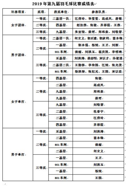 場上隊員聚精會神、拼盡全力,場下觀眾掌聲不斷、歡呼雀躍,充分展現了公司員工奮勇爭先、努力拼搏的精神面貌。經過激烈的比拼,張敏、劉洪濤一路披荊斬棘、過關斬將,分別獲得女子單打一等獎和男子單打一等獎;男子團體一等獎和女子團體一等獎分別被二基層男子一隊、二基層女子一隊收入囊中。